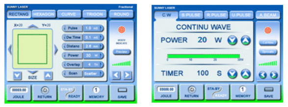 – Modulación completa del efecto ablativo–térmico para un control absoluto de los tratamientos: A través de los diferentes manípulos y a través del software podrá dosificar según el efecto que desee producir. El software incluye preprogramas de tratamiento para facilitar su uso.